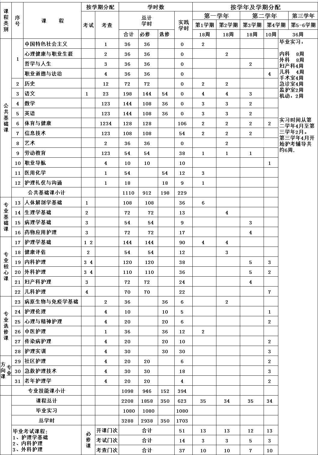 18 | 护理实训 | 加强实训,培养高素质实用型、技能型护理人才。突出重点操作,熟悉各项基本操作,紧密结合临床,调动学生练习的积极主动性,加强实践考核,注重学生综合素质的培养,使学生逐渐熟悉环境,尽早进入角色,拉近学生与岗位的距离。 | 30 |