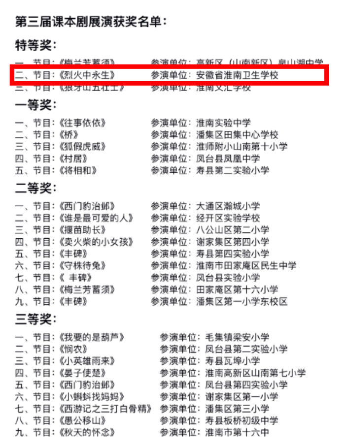 2024年11月11日下午,“我们的舞台”第三届淮南市中小学课本剧展演颁奖典礼在淮南广播电视台600平方米演播大厅举行。此次活动由淮南市教育体育局、淮南广播电视台、淮南传媒集团、淮南市交通运输综合行政执法支队共同主办,淮南音乐故事广播承办。我校课本剧《烈火中永生》在此次展演活动中荣获特等奖。